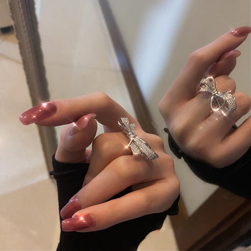 LIVVY シルバーカラービッグちょう結びリングブリンブリンジルコン結婚式婚約ジュエリーギフトアクセサリー リボン 指輪 銀