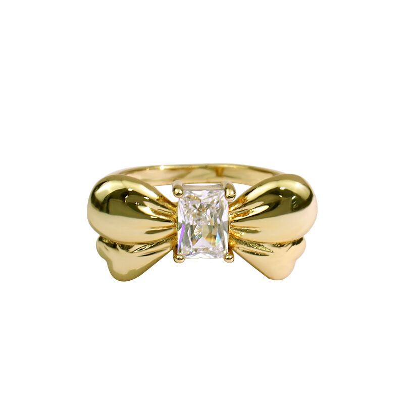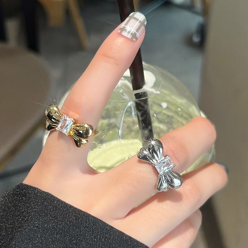 LIVVY シルバーカラーユニークちょう結びジルコンオープンリングガールトレンディウェディングパーティージュエリーギフト リボン 指輪 銀