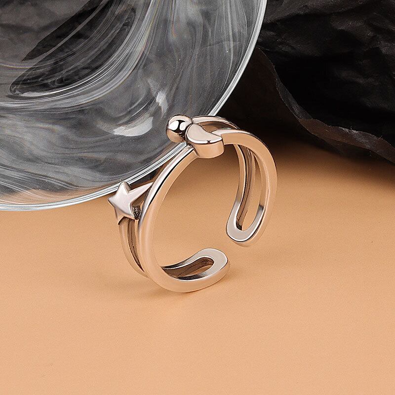 LIVVY ミニマリストダブルデッキシルバーカラームーンスターオープニングリングカップルジュエリーギフト 指輪 銀