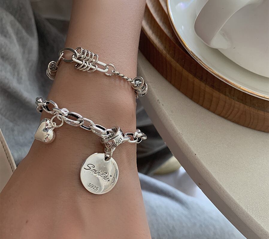 LIVVY シルバーカラー甘い愛ハート笑顔ラウンドブレスレットトレンディレトロシンプル手作りジュエリーギフト 大人ガーリー スウィート キュート カジュアル 銀