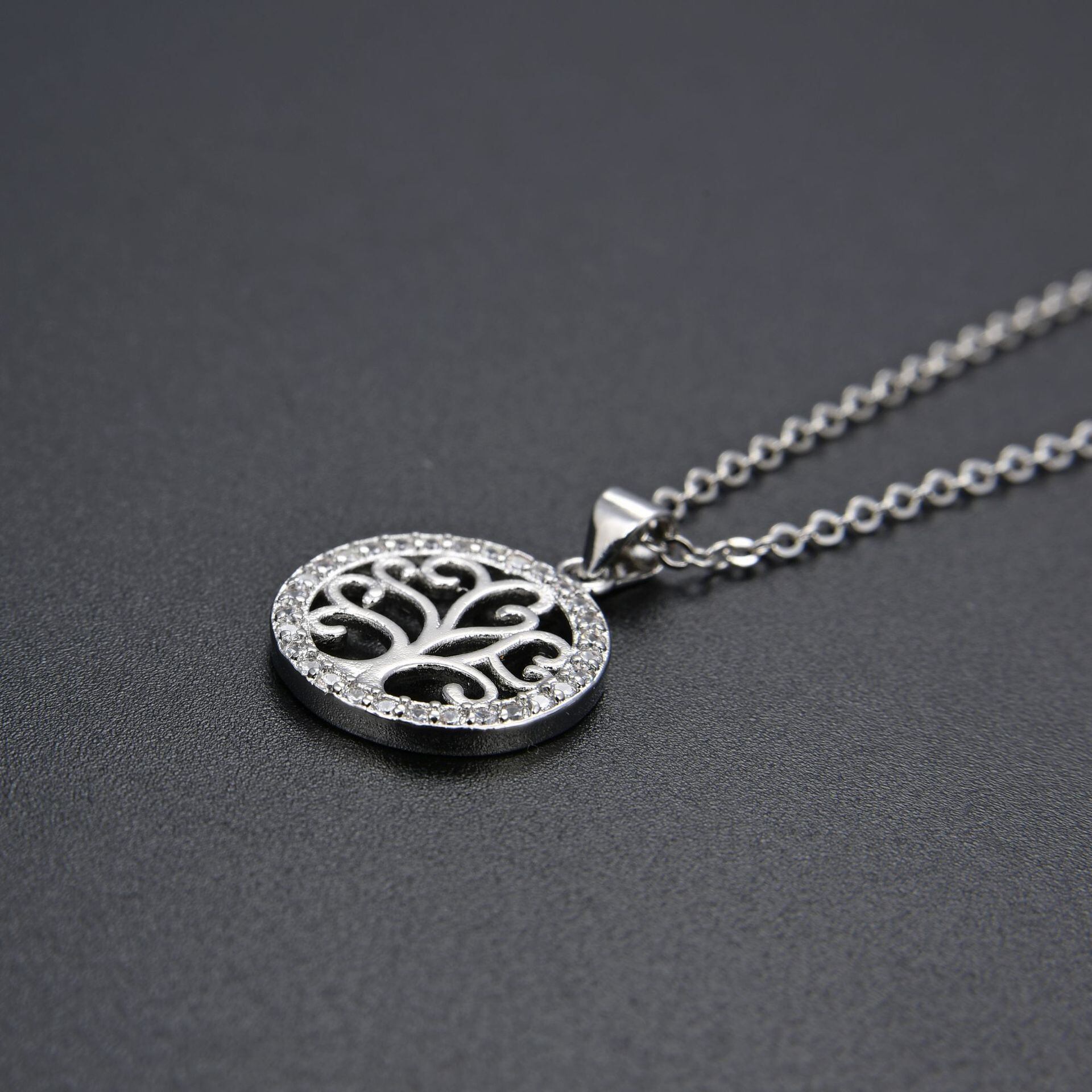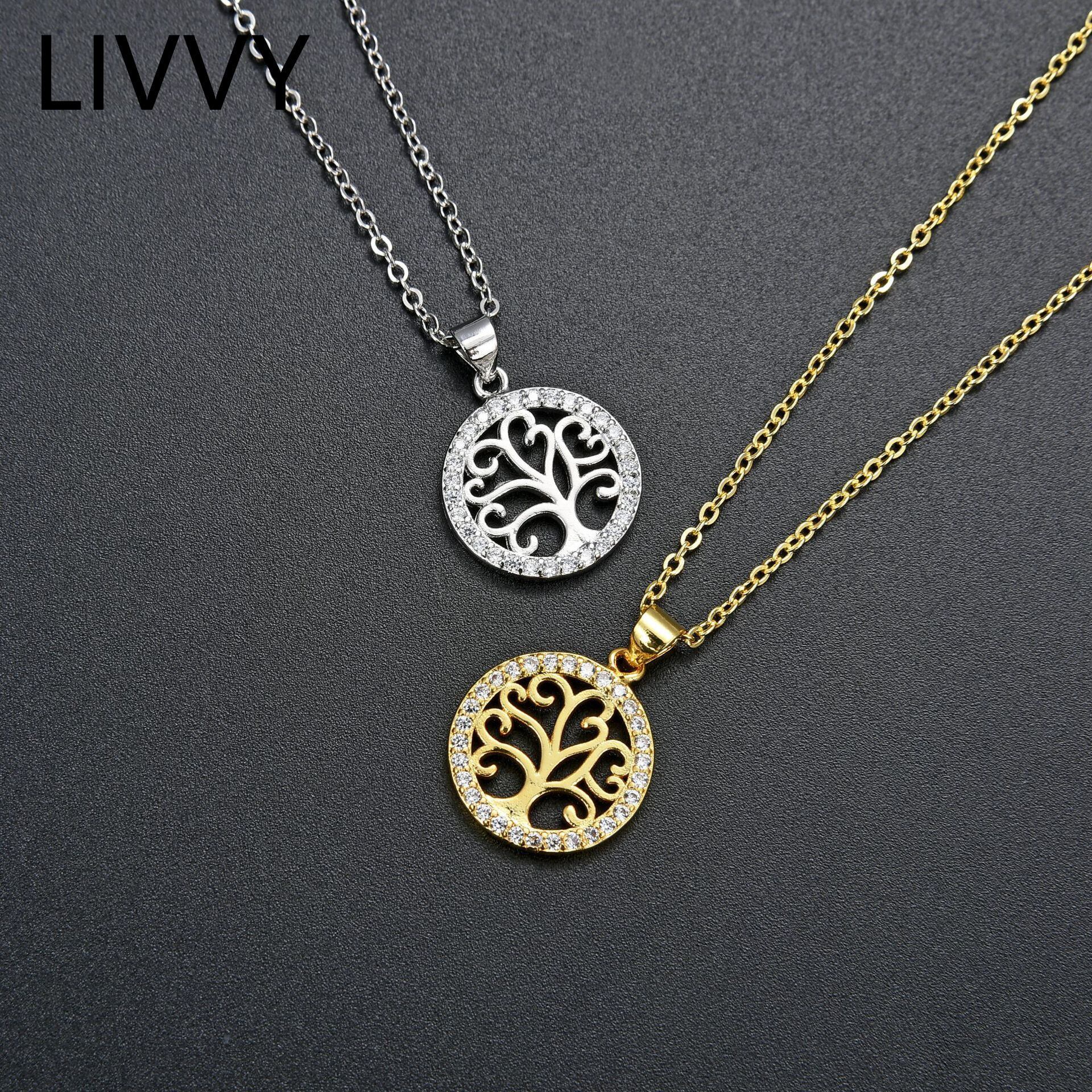 LIVVY シルバーカラー創造ツリー繊細ネックレスクリスタルジルコンラウンド中空ペンダントチェーンジュエリー レース 銀