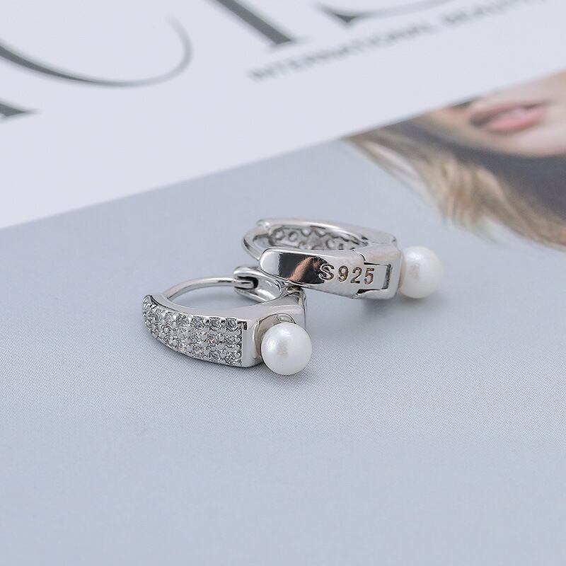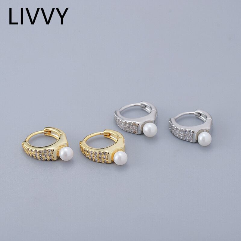 LIVVY シルバーカラートレンディシンプルパールジルコン耳クラスプフープイヤリングファインエレガンスジュエリーギフト 真珠 指輪 銀
