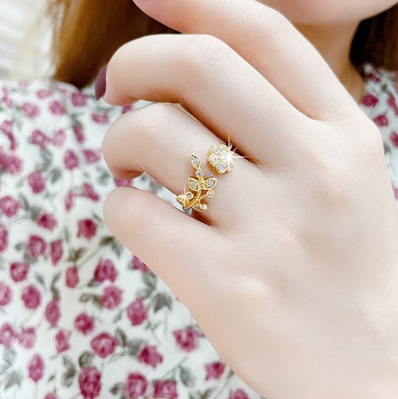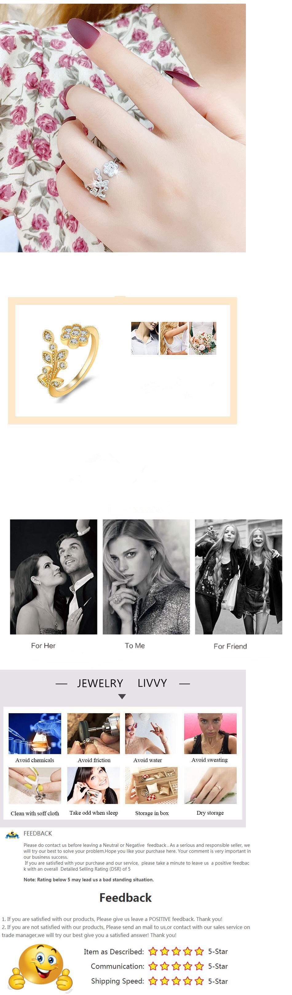 LIVVY シルバーカラー優雅葉花両端オープンリングガールパーティーリングシャインクリスタルジルコンジュエリー 指輪 フラワーデザイン 銀