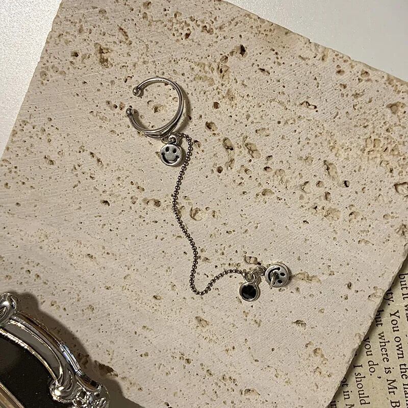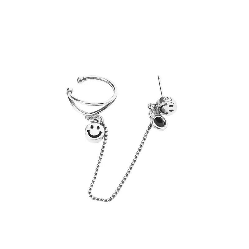 LIVVY シルバーカラー笑顔ドットチェーンテルピアスブラックラウンドシンプルユニークチャームジュエリーカップルギフト イヤリング リング 指輪 銀