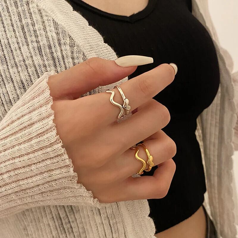 LIVVY シルバーカラー INS スタイル二層波状曲線不規則ハートリング滑らかロマンチックジュエリーアクセサリー 指輪 銀