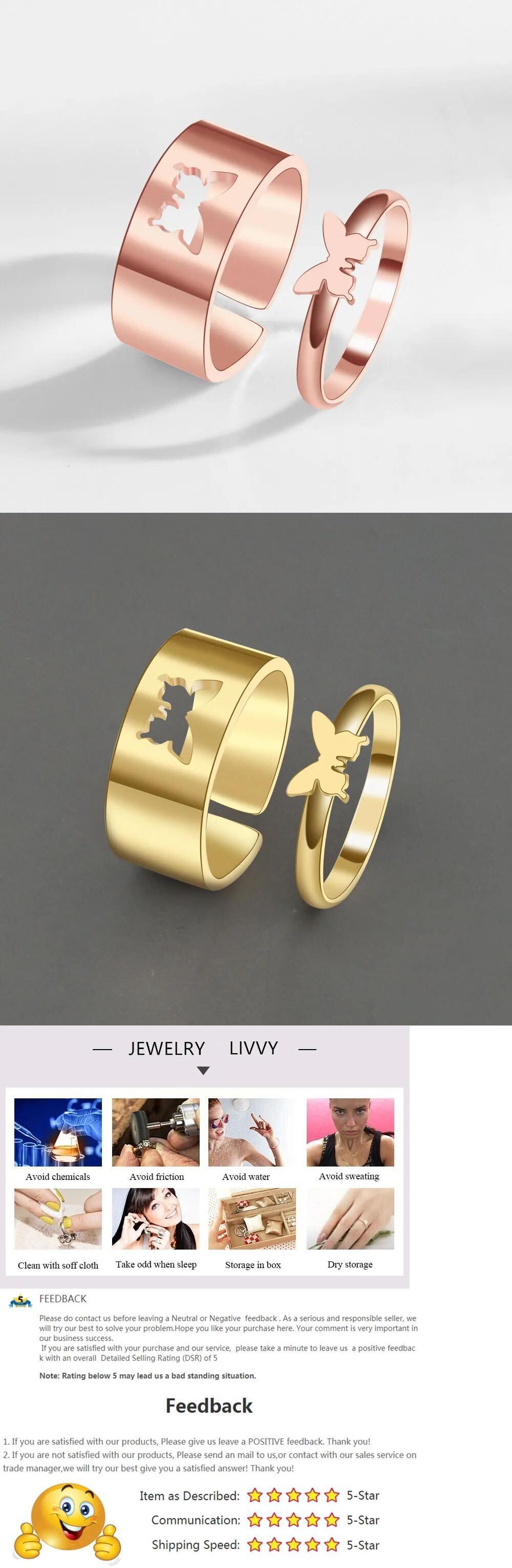 LIVVY 2 ピース/セットシルバーカラー蝶リングカップル結婚式オープン調節可能リングギフトパーティージュエリー アジャスタブル 指輪 銀