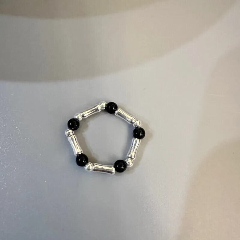 LIVVY スタイルシルバーカラーブラックラウンドパールリングガールスウィートレディパーティージュエリーギフト 大人ガーリー キュート カジュアル 指輪 真珠 銀