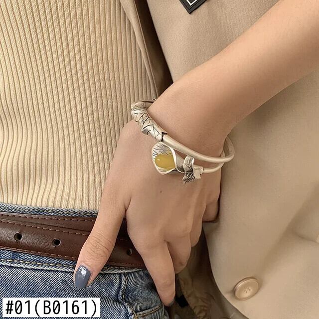 LIVVY エスニックスタイルニッチフラワーシルバーカラーブレスレットライト豪華調整パーティージュエリーギフト フラワーデザイン 銀