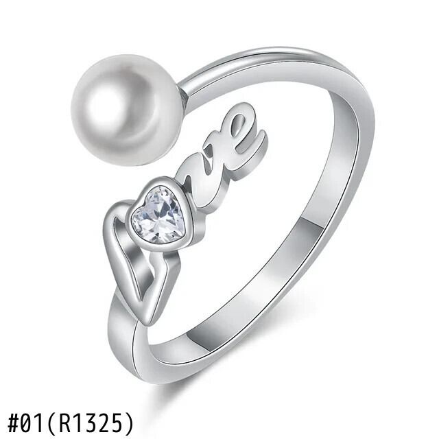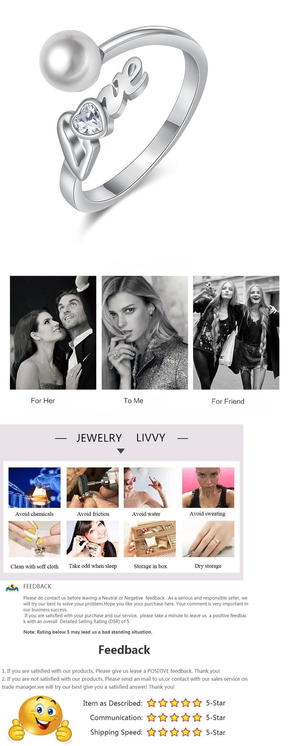 LIVVY シルバーカラーパールラブハートクリスタルジルコン調節可能リングトレンディ手作りファインジュエリーギフト アジャスタブル 指輪 真珠 銀
